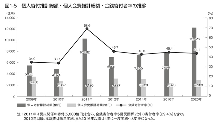 まず全体的な傾向として言えるのは、日本人の寄付行動がこの十数年でかなり変化したことだ。調査を開始した2009年に約5,500億円だった個人寄付の総額は、2011年3月の東日本大震災を契機に初めて1兆円を超え、2020年には約1兆2,000億円に上った(金額はふるさと納税を含む)。金銭による寄付を行った人の割合も、09年は約3割だったのが、11年には約7割に跳ね上がり、その後は4割台が定着。とはいえ、先進国の中では寄付総額・寄付者率ともに依然として低い水準にあり、寄付先進国とされる米国と比べると個人寄付の総額は約30分の1に留まっている。