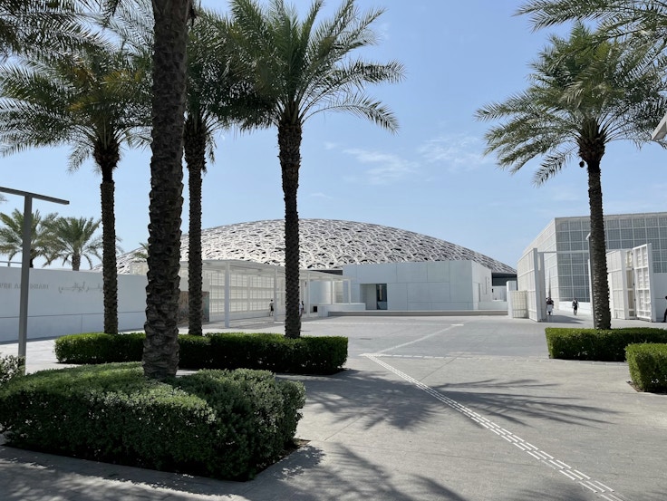 万博鑑賞後、はじめて中東を訪れた筆者にとってサディヤット島は「まるでずっと万博しているみたい」だった。現在も開発がつづく文化地区には、ルーヴル・アブダビ、チームラボ・フェノメナ・アブダビ、グッゲンハイム・アブダビ(建設中)などが所狭しと並んでいる。ルーヴル・アブダビでは、ユーラシア主義的な想像力に基づいているのか、自国はもちろんのこと、中国からレバノン、パキスタン、エジプト、イタリア、フランスまでの彫刻や彫刻や絵画、地図などが詰め込まれることで、中東地域の文化的かつ地政学的な価値を誇示していた。そうした展示施設に取り囲まれて鎮座する3つの立方体、アブラハム・ファミリーハウスはキリスト教、ユダヤ教、イスラム教の礼拝空間を並列したものであり、7ヶ国が集まって成立したアラブ首長国連邦の複雑な共生を感じさせる。一連の体験は、本来的に万博が達成すべき景色を圧倒的な財力によって叩きつけられるようであった。