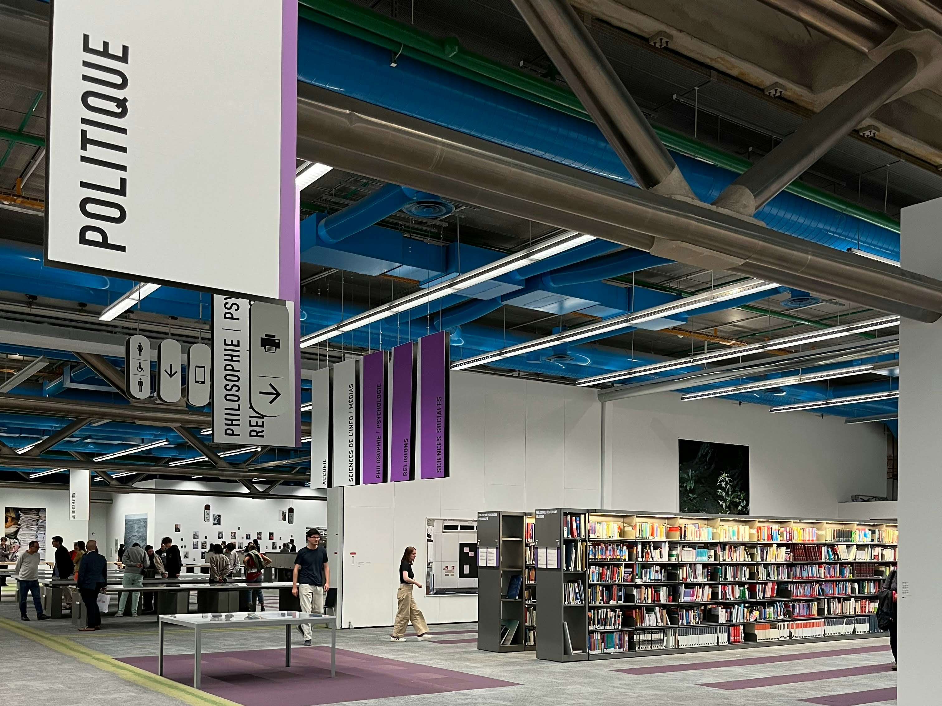 ポンピドゥー・センター大規模改修休館前の最終展を白紙委任されたティルマンスは、2階のパリ公共情報図書館の約6000平方メートルを会場に、パイプむき出しの天井、書棚や机、配置や動線を示すカーペットのしるしといった歴史や痕跡を意図的に残し、フロア全体を巨大で実験的なインスタレーションとして展開。35年以上におよぶ創作の軌跡をふり返る本展では、写真、映像、音楽、出版物など多岐にわたる表現や活動が、彼の私的な秩序をもって非時系列に並べられ、鑑賞者は選択と編集をうながされる。図書館で自習するように能動的に鑑賞し、写真の「真実性」がゆらぐ不確実な時代に、それでも世界を「見る」意味をゆっくりと考えた。空間の果たしてきた機能に回帰しつつ役割を更新する、別れと始まりにふさわしい展覧会だった。