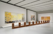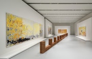 ギャラリー正面の壁面を飾る《Untitled》(1979)は、長さ4メートルの三連画。圧倒的な面積を占めるイエローのタッチの下に、やや控えめに淡い紫の色彩が見え、左右のキャンバスの下層には、さらに狭い範囲で濃いブルーの絵具が見え隠れしている。ストロークは長いものから短いものまで縦横無尽、一気呵成に描かれており、垂れ落ちる絵具の流れもそのままに定着されている。しかし、その筆勢の迫力にもかかわらず、全体に明るい色彩の効果からか、決して激情的な印象ではなく、むしろ、燦燦と陽光を浴びながら輝く自然の風景のように、穏やかで柔らかな雰囲気に包まれている。