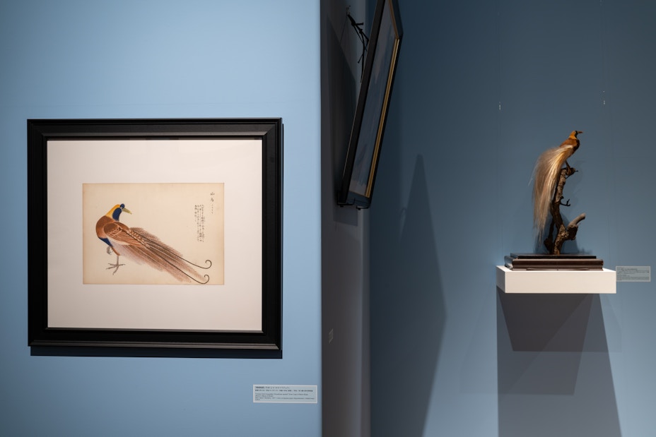 松原 当館には、オオフウチョウの剥製標本が11体あります。もともとこれを一斉に展示したいという思いがあったので、展覧会タイトルが「極楽鳥(BIRDS IN PARADISE)」であると聞いたとき、すべて並べて「極楽」をつくることができるチャンスだと考えたのです。そして、剥製とジュエリー、ドローイングを一緒に展示すれば、美しい鳥を見たときに人間はそれをどうデフォルメし、デザインに落とし込むことができるかを見ることもできます。