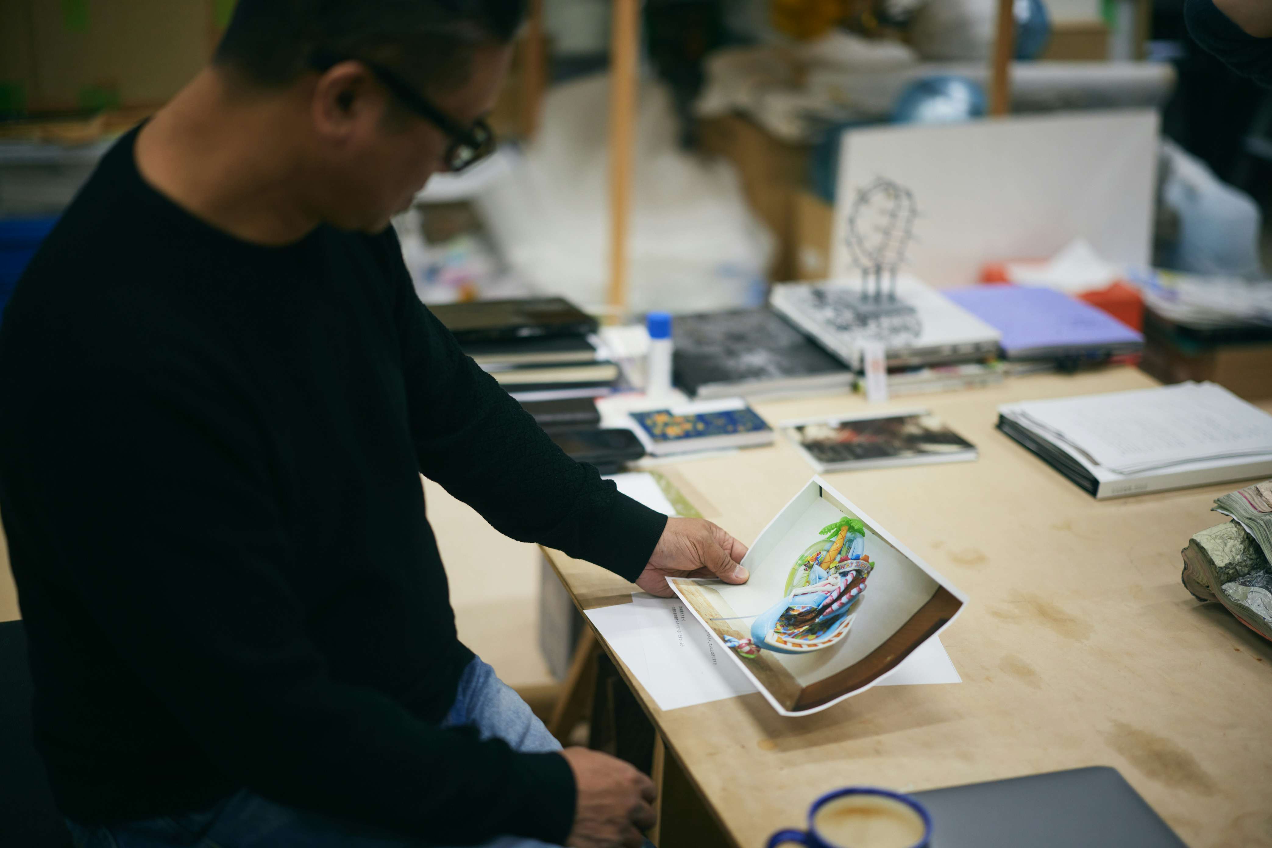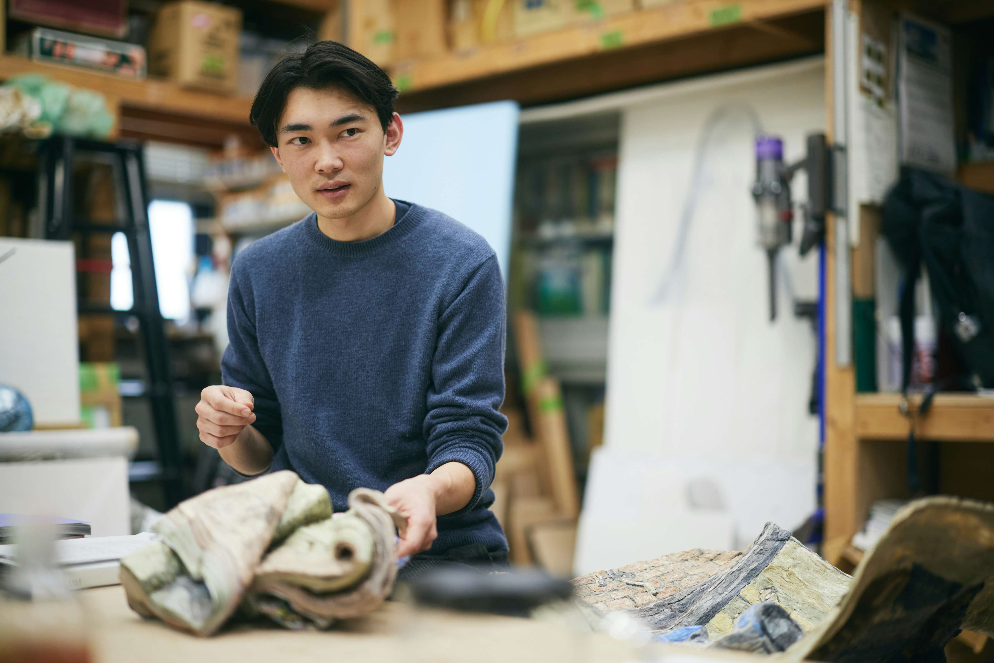 アドバイザリーボードになると、若手出品作家を推薦する役割が与えられます。さて、だれを推せばいいか。そのとき、まだ作品発表の機会が少なく、けれどおもしろい試みをしている人を選ぼうと決めました。そう考えて周りを見渡したとき、頭に浮かんだのは本岡景太さんでした。私が勤める東京藝術大学内で、本岡さんの制作風景はよく目にしており、日頃から「これ何? どういうこと?」と、あれこれ気になって尋ねることが多くありました。彫刻をつくる際、多くの人は壊れにくい丈夫な素材を使うのに、彼は珍しく紙を用いていました。制作プロセスも独特で、「歪曲張り子」という技法を自分で編み出していた。活動拠点の関東から離れた京都で彼の作品を見せたらどういう反応があるだろう?と、すごく興味が湧いたのを覚えています。