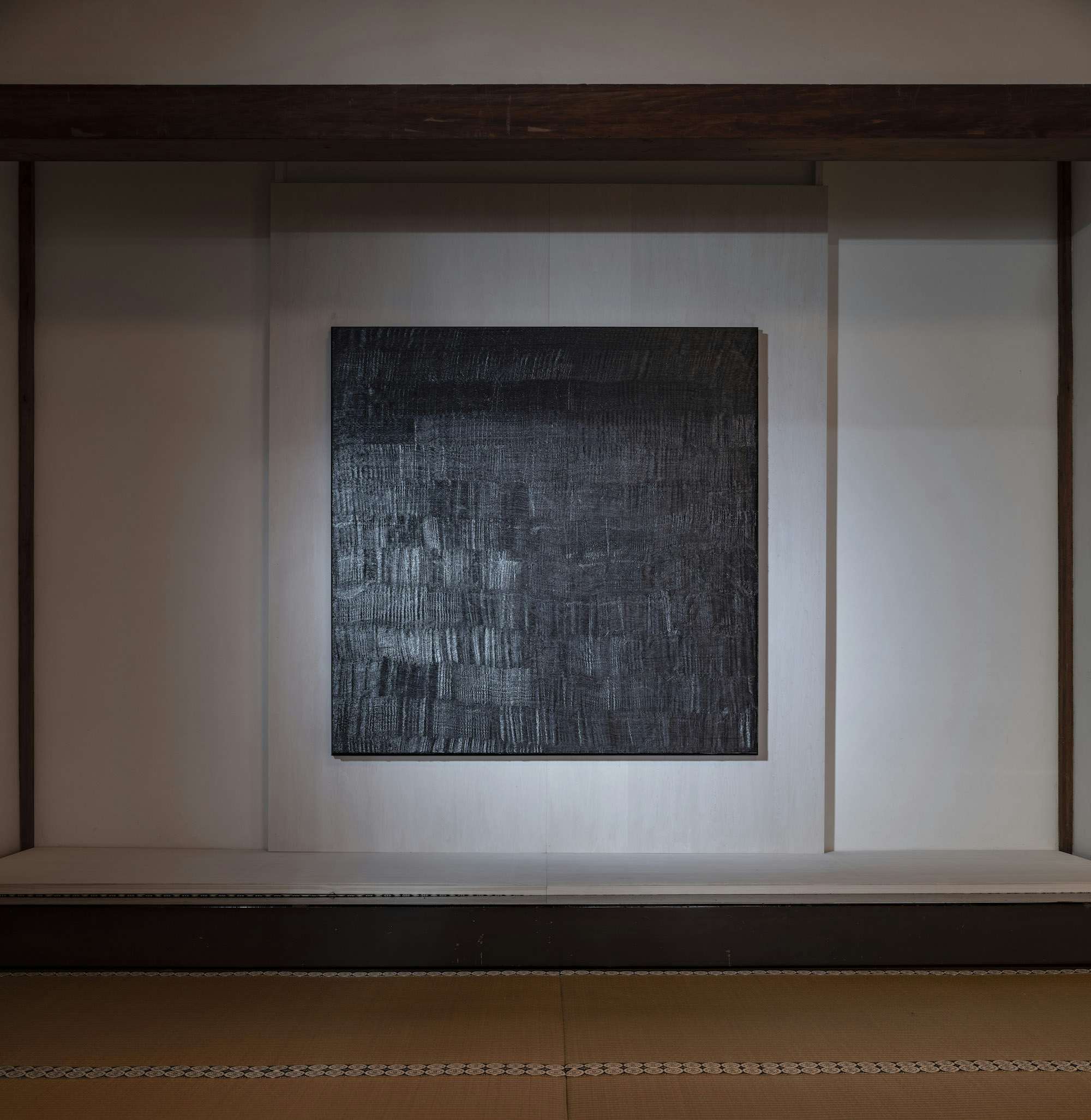 大巻 どんな空間になるか楽しみですね。彫刻はとくにそうですが、展示して初めて見えてくる側面がきっとあるものです。アトリエで悶々と制作しているときと外に出したときでは、作品の見え方は明らかに違ってきます。ましてや会場は東福寺の内部。あそこで展示するのは大変なことです。私も2025年のAFKでアドバイザリーボードとして展示に参加し、東福寺の空間と対峙しました。空間に負けず、それでいて調和するものをと考え、床の間に《Drawing in the Dark》(2024)を掛けました。真っ暗闇のなかで何時間も、ひたすら手を動かし続けて描いたドローイングです。何かをつくろうとすると、どこか理屈や説明をつけたくなるものだけど、そこをぐっと我慢して、もっと自分の身体性を前面に出し、内と外が溶けて曖昧になるような領域に踏み込む。そうして闇のなかから、自分の揺らぎみたいなものを感じ、つかんでレコードしていく。そういう行為によってできているのがこの作品です。自分のやっていることはまるで写経だなと思うところもあって、東福寺の空間にもきっと合うだろうと思いました。
