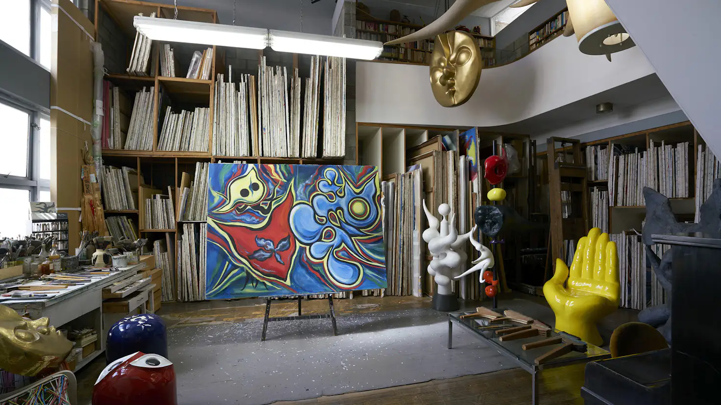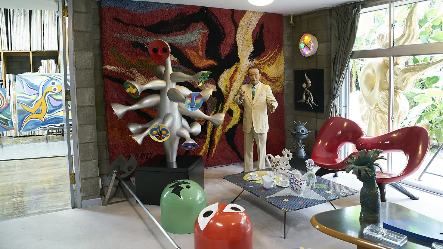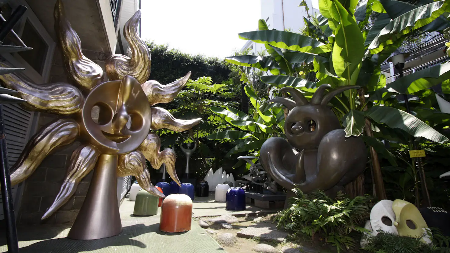 岡本太郎記念館は、岡本太郎が亡くなる1996年まで、アトリエ兼住居として50年近く使用されたスペース。戦災で焼失した旧居では、岡本一平・かの子・太郎の一家が長く暮らし、戦後はル・コルビュジェの愛弟子であった友人の坂倉準三に設計を依頼してアトリエを建てた。ブロックを積んだ壁の上に凸レンズ形の屋根が乗ったユニークな建物は、現在は記念館としてアトリエ、サロン、庭を公開し、企画展示室では随時企画展を開催。日本万国博覧会の《太陽の塔》をはじめ巨大なモニュメントや壁画など、あらゆる作品の構想を練り、制作した場所には、太郎のエネルギーがいまも満ち満ちている。