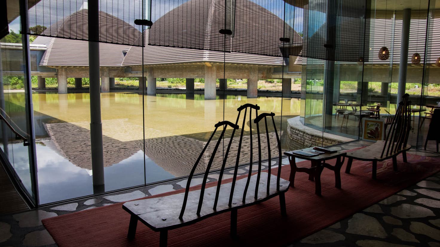 田中一村記念美術館は2001年、鹿児島県奄美パーク内に開館。日本画家・田中一村のコレクションを常設展示する美術館。建物は、奄美大島の海をイメージしてつくられた池の上に高倉を模した展示室が建ち並ぶ特徴的な設計となっている。
