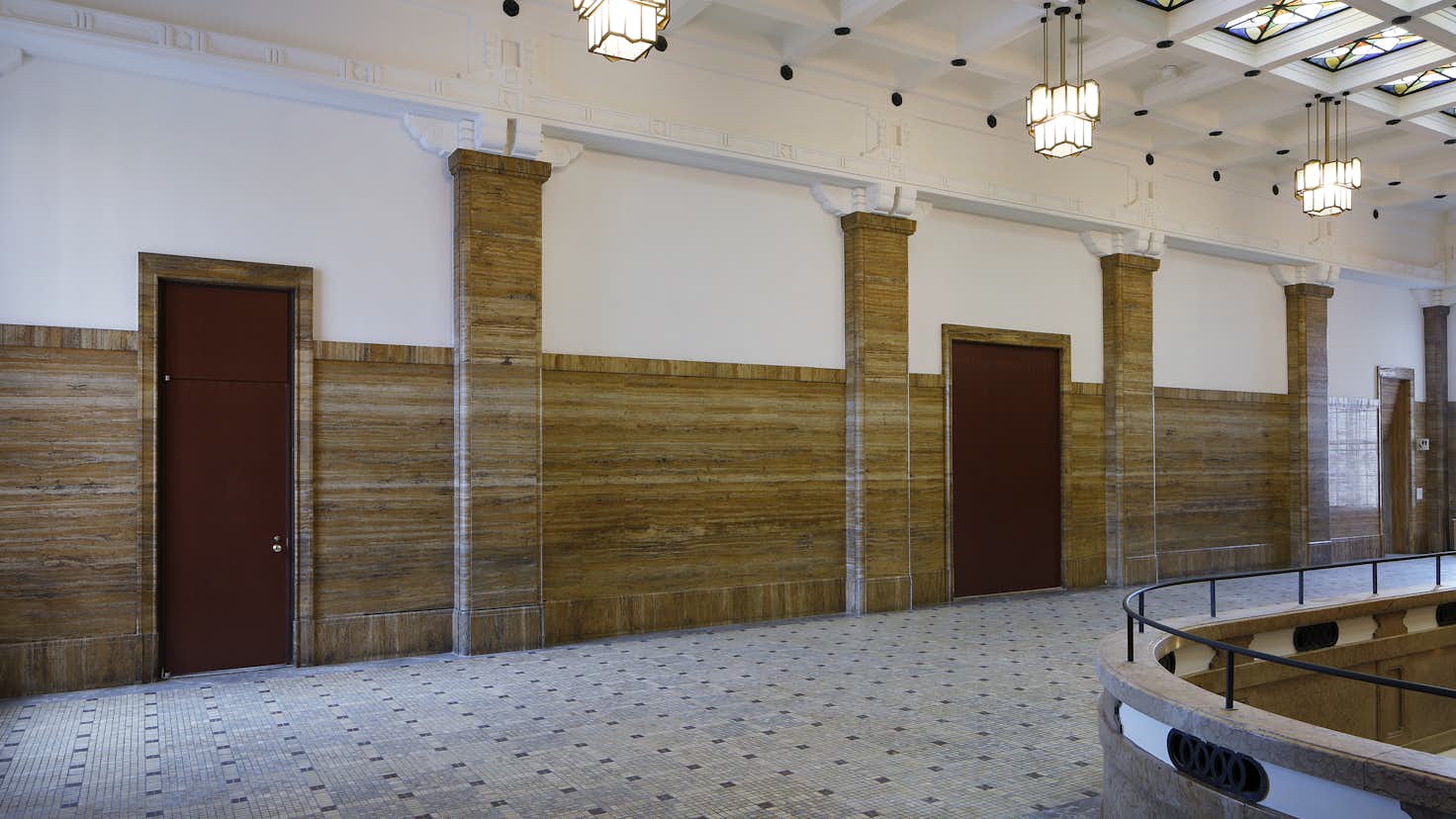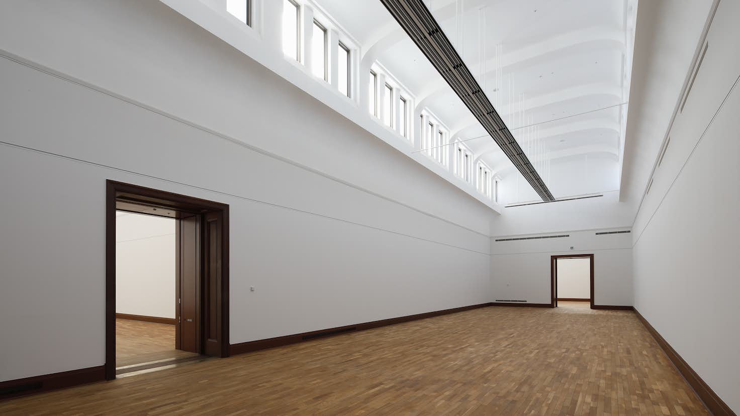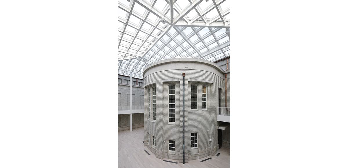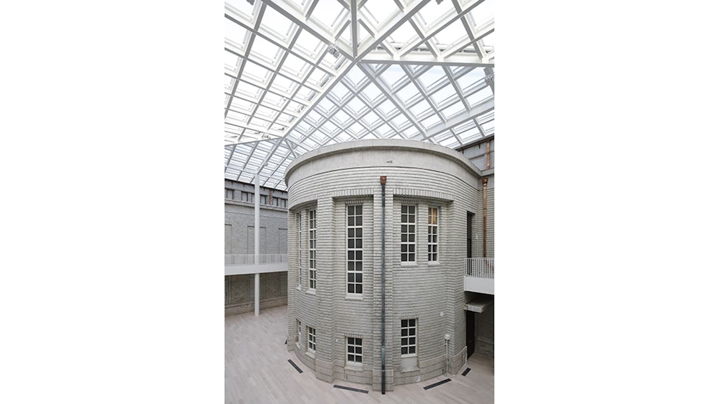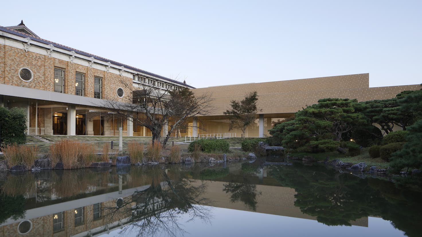 本館は帝冠様式の外観をそのままに、建物の中心に位置する中央ホールを通って館内の各スペースや日本庭園などの外部施設へ往来できるようリノベーション。南回廊1階には、京都画壇の名品を中心に紹介する「コレクションルーム」を新設し、これまで使われていなかった2つの中庭を公開している。北回廊側はガラスの大屋根を介して日光が差し込む「光の広間」として開放。南回廊の中庭「天の中庭」では、新鮮な外の空気にふれられるスペースで収蔵品の展示やワークショップなどを行う。